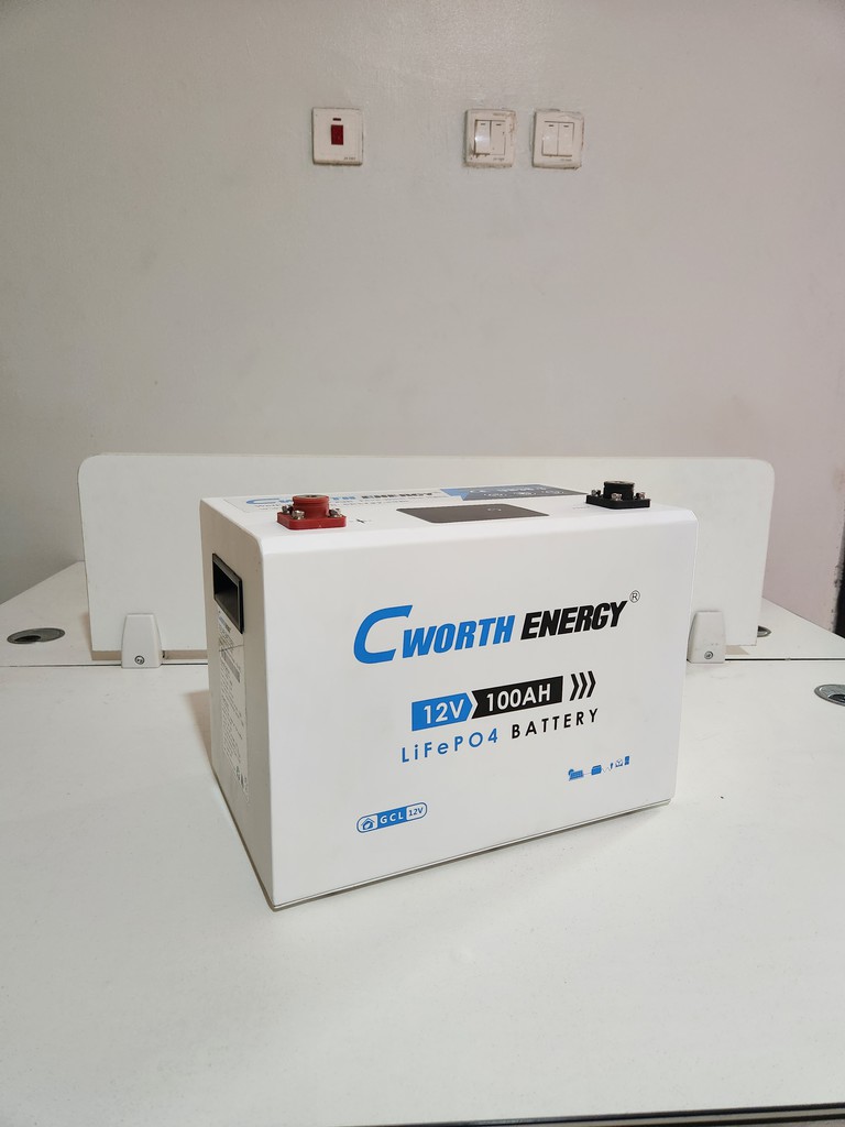 Cworth Energy 1.3 kWh LiFePO₄ battery model CE-GCL-12100 — nominal 12.8 V / 100 Ah (≈1.28 kWh) with operating voltage range ~12–14.4 V, charge cut-off 14.4 V and discharge cut-off 12 V; built-in intelligent BMS with protections (overcharge, over-discharge, short-circuit, over-temp), max charge/discharge current ~100 A. Three years warranty. PRICE – ₦210,000