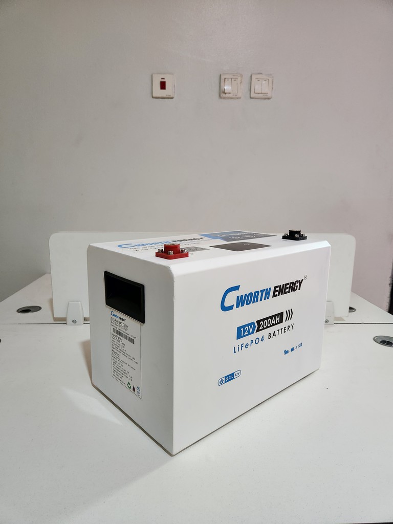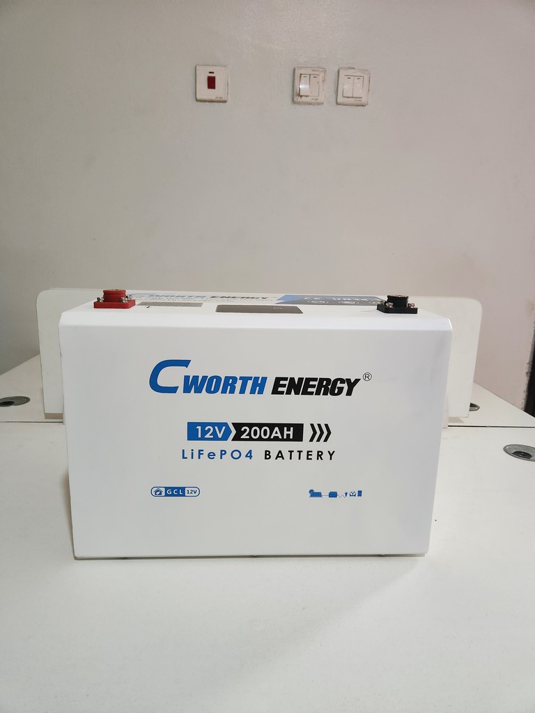 The Cworth Energy 2.5-kWh LiFePO₄ battery (model CE-GCL-12200) — 12 V nominal (12.8 V), capacity ~2.56 kWh, operating voltage 12–14.4 V, charge cut-off 14.4 V, discharge cut-off 12 V; intelligent BMS with protections, max charge/discharge current ~150 A. Three years company warranty. PRICE – ₦400,000